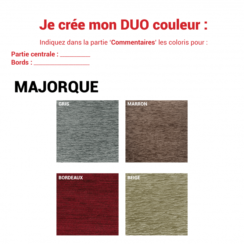 Possibilité de faire son propre mix de couleurs : • Sélectionnez DUO en faisant défiler les couleurs -> Indiquez dans la partie 'Commentaires' les coloris pour la partie centrale et les bords.
