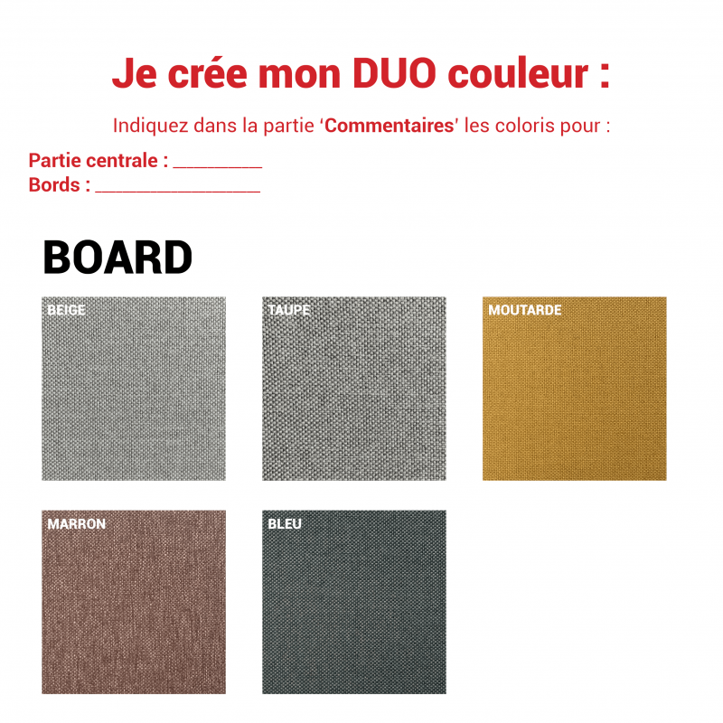 Le tissu Board dispose de plusieurs coloris : du jaune pour une touche à la fois dynamique tout en apportant de la fraîcheur, du bleu pour rafraîchir votre camping-car, ou des couleurs plus neutres comme le taupe, beige ou marron pour apporter de l’élégance.